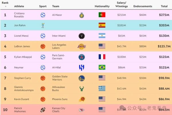 前10位中的另两位足球员,分别是第5位的姆巴佩和第6位的内马尔,NBA方面,最高仍是去年收入冠绝体坛的勒布朗詹姆斯,但他在整个体育界则由收入第1位跌落到第4位,而斯蒂芬·库里、扬尼斯·阿德托昆博和杜兰特,则顺序列在第7至第9位。